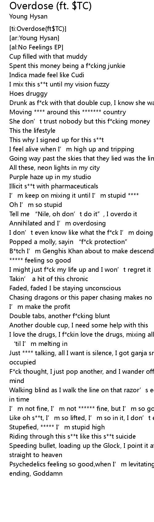 | [01:40.09] | I love the drugs, I f*ckin love the drugs, mixing all this substance ‘til I’m melting in |