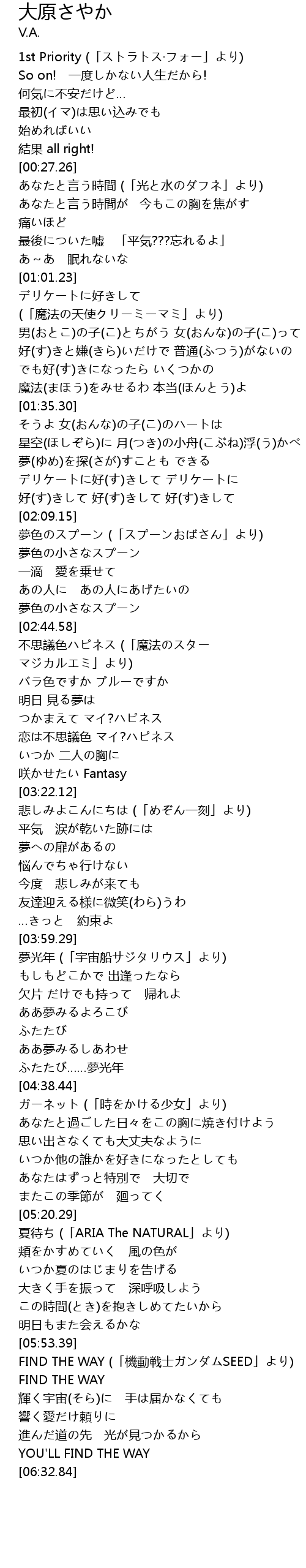| [00:01.31] | 1st Priority (「ストラトス·フォー」より) |