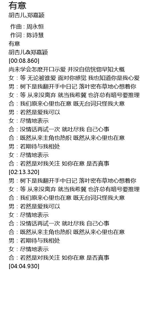 | [00:07.160] | 胡杏儿&郑嘉颖 |