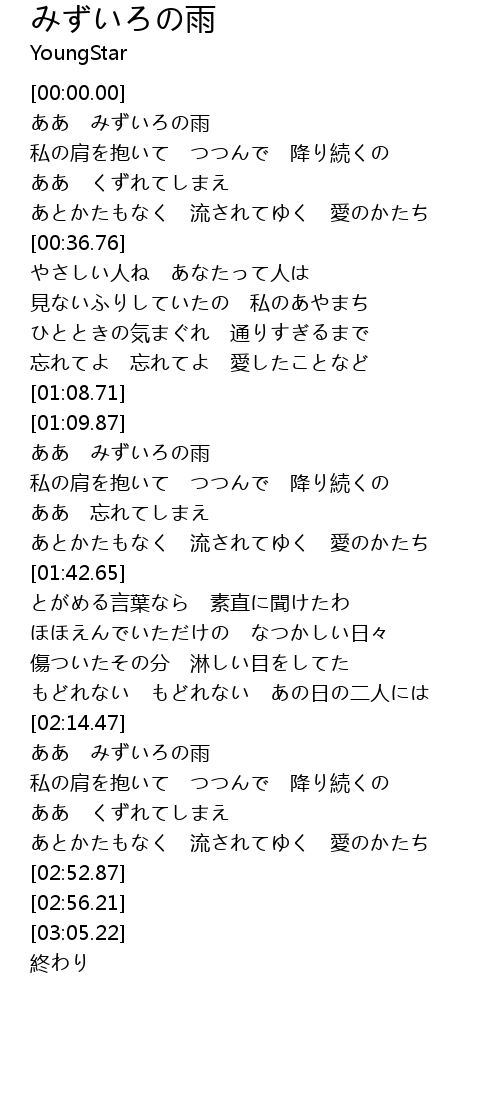 | [02:23.11] | 私の肩を抱いて つつんで 降り続くの |