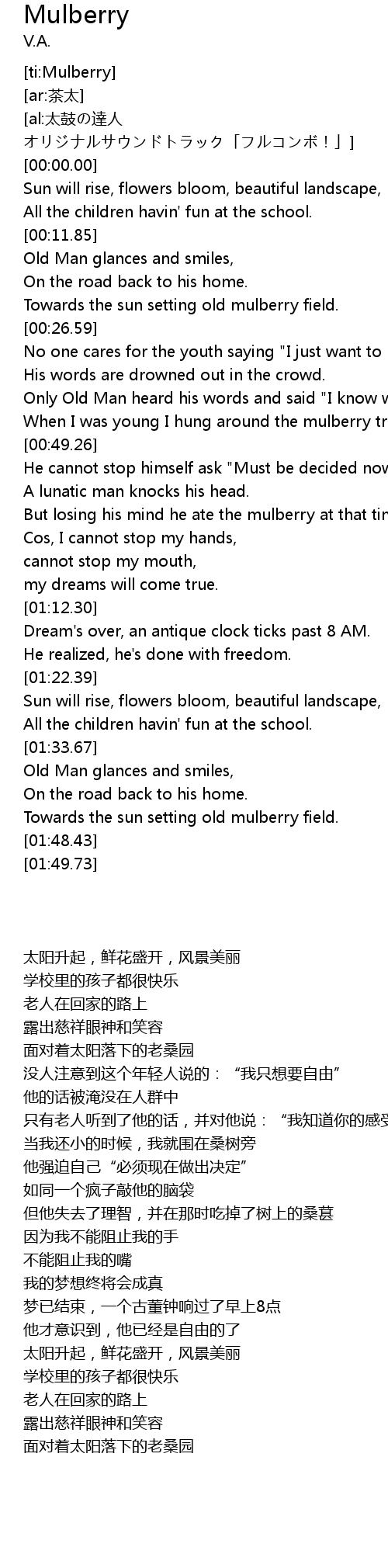 | [00:43.50] | When I was young I hung around the mulberry tree." |