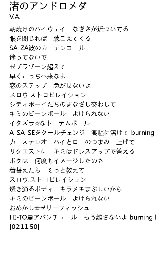 | [01:13.78] | A-SA-SEをクールチェンジ 潮騒に溶けて burning heart |