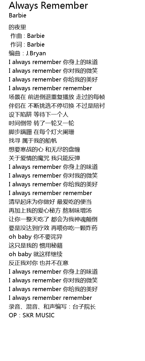 | [00:17.82] | I always remember nǐ shēn shàng de wèi dào |