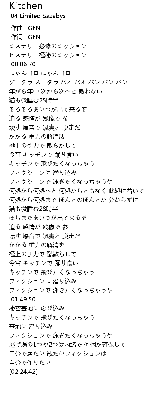 | [01:36.63] | 今宵 キッチンで 踊り食い |