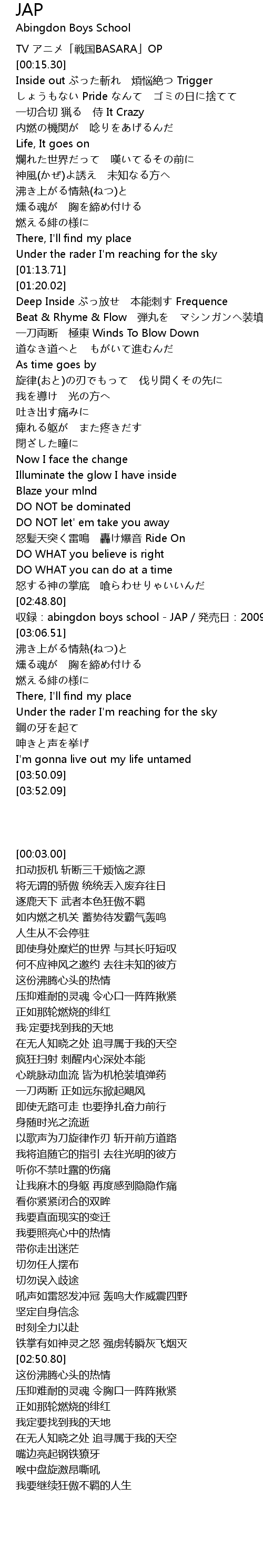 | [02:50.80] | shōu lù: abingdon boys school JAP fā mài rì: 2009 05 20 |