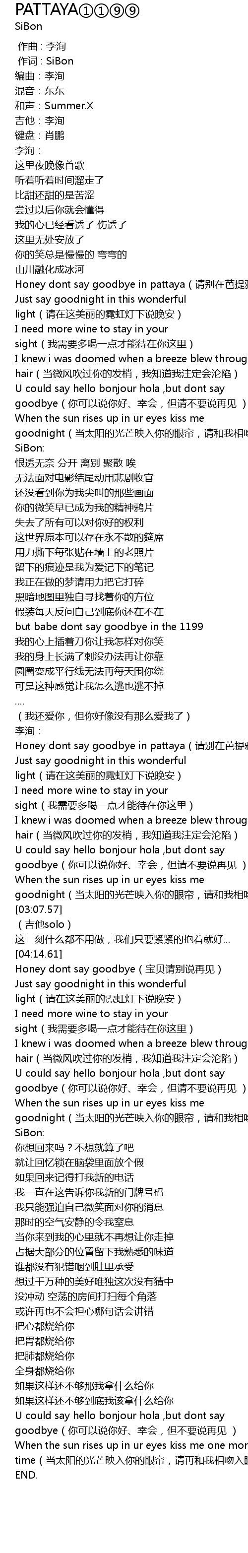 | [01:02.19] | Honey dont say goodbye in pattaya(请别在芭提雅说再见) |