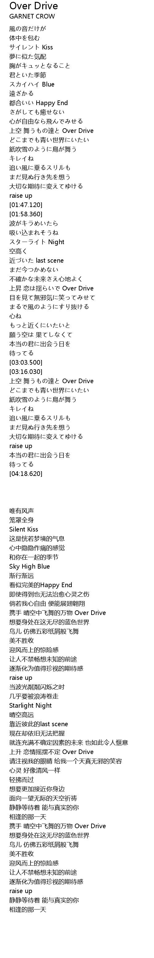 | [03:18.030] | shàng kōng wǔ dá Over Drive |