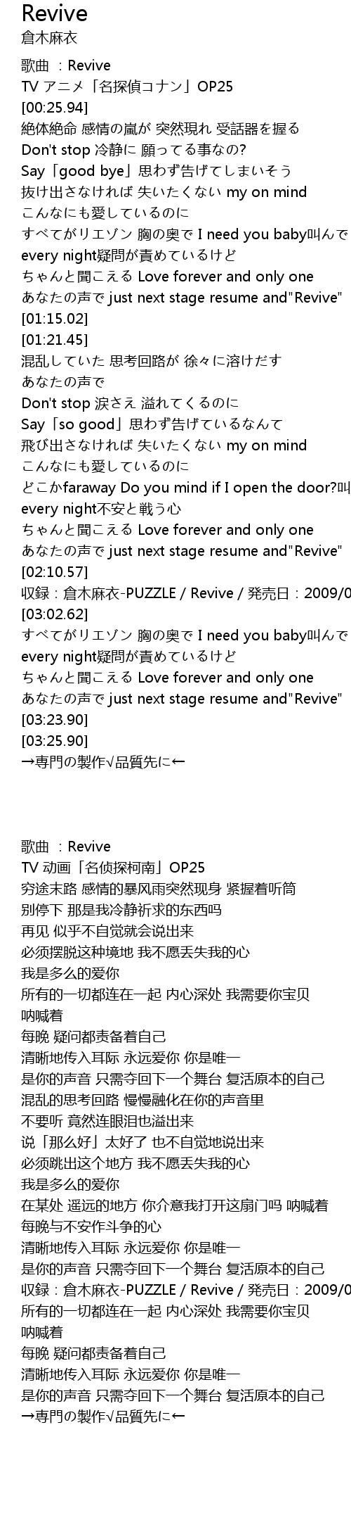 | [02:12.57] | 収録:倉木麻衣-PUZZLE/Revive/発売日:2009/04/01 |