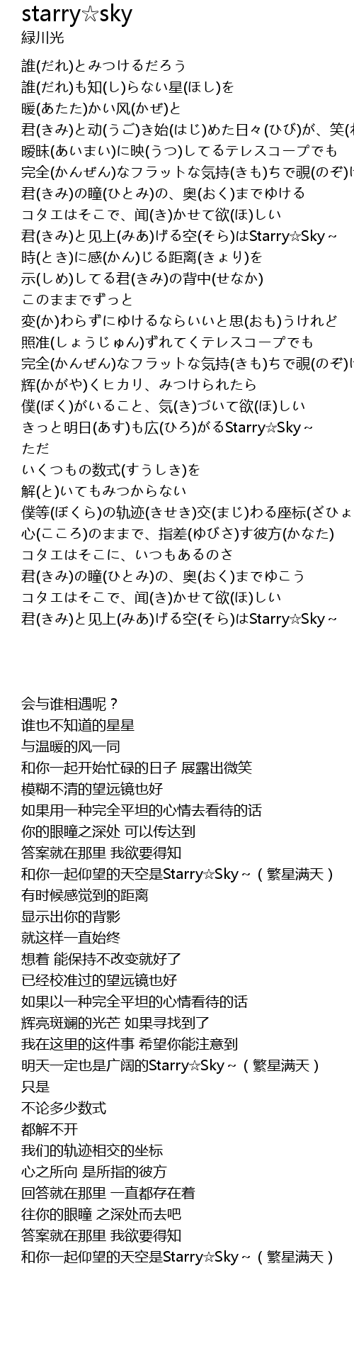 | [02:40.840] | きっと明日(あす)も広(ひろ)がるStarry☆Sky~ |