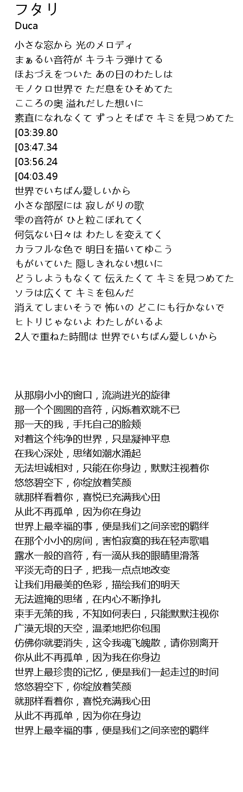 | [04:03.49] | 世界上最幸福的事,便是我们之间亲密的羁绊 |