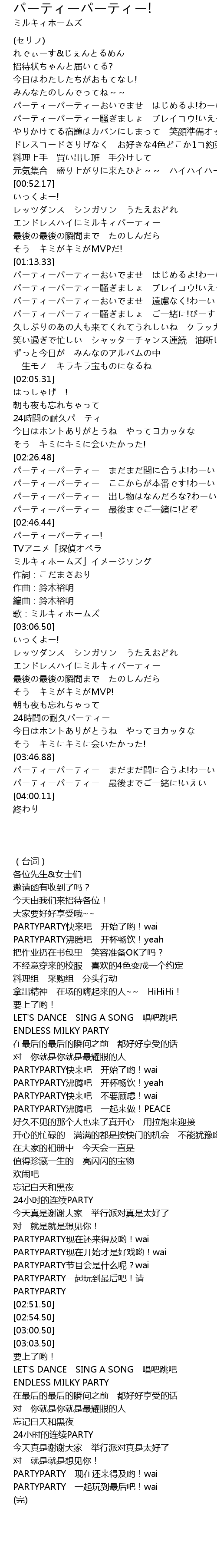 | [00:10.36] | パーティーパーティーおいでませ はじめるよ!わーい |