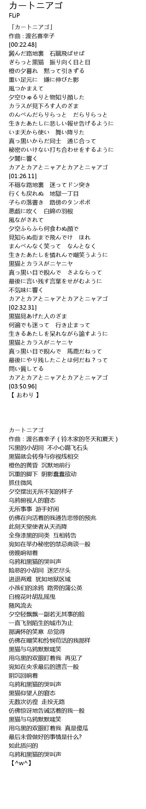 | [01:21.76] | カアとカアとニャアとカアとニャアゴ |