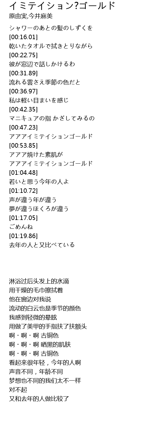 | [01:00.64] | アアアイミテイションゴールド |