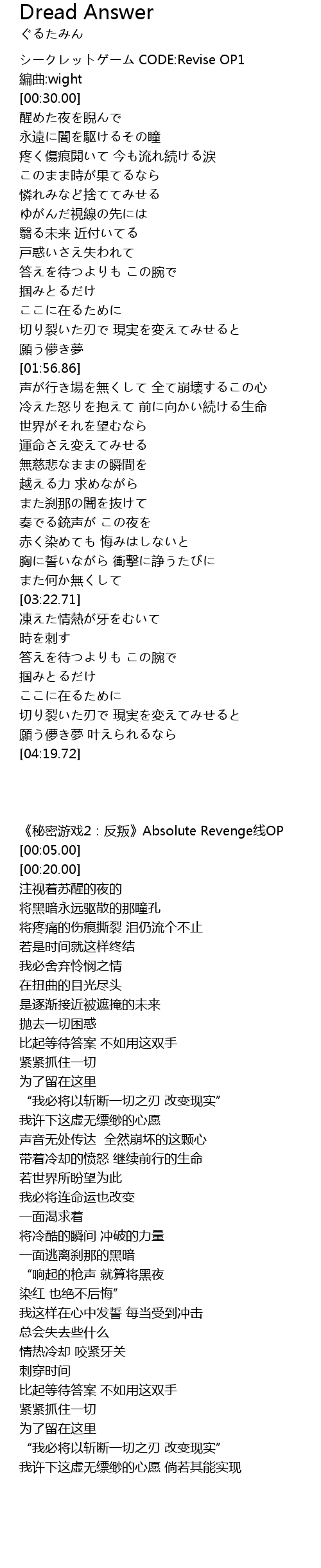 | [00:00.00] | 《秘密游戏2:反叛》Absolute Revenge线OP |