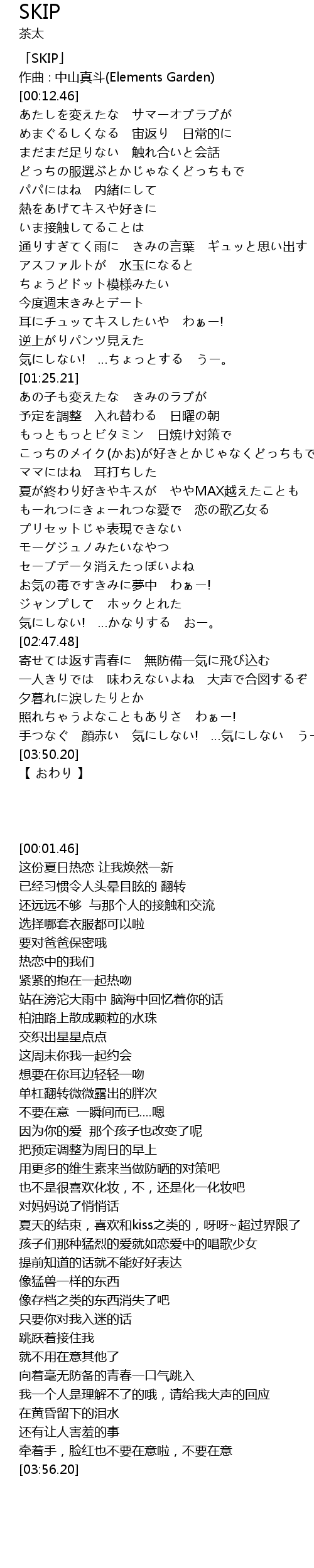 | [02:08.35] | 夏天的结束,喜欢和kiss之类的,呀呀~超过界限了 |