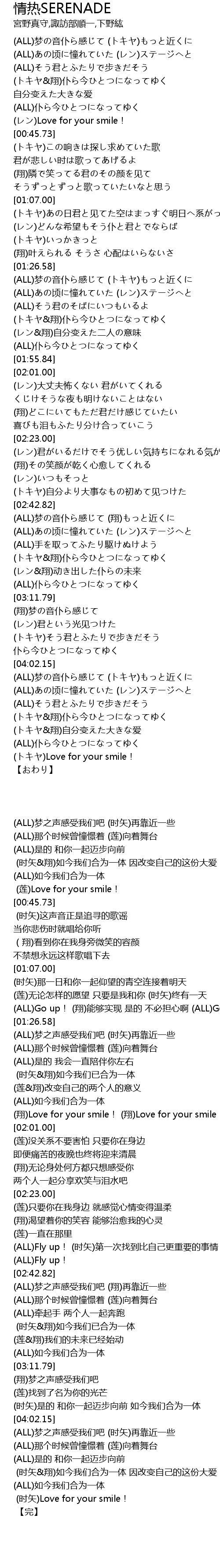 | [04:02.40] | (ALL)梦之声感受我们吧 (时矢)再靠近一些 |