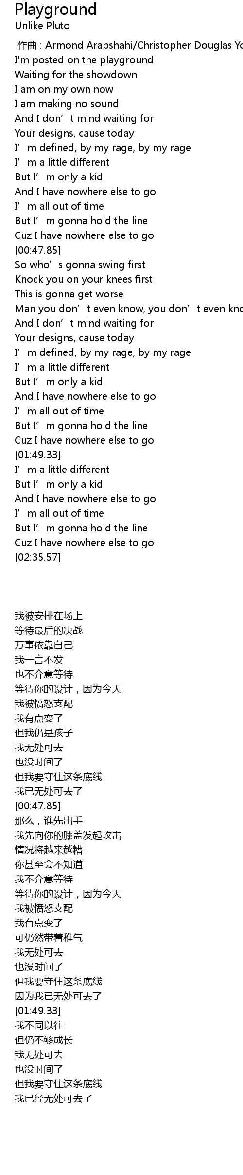 | [00:00.19] | I'm posted on the playground |