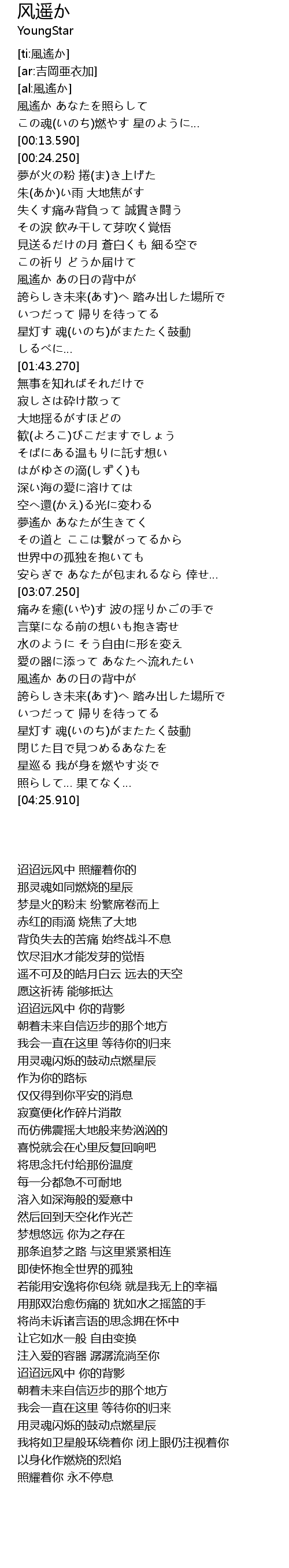 | [03:55.580] | 星灯す 魂(いのち)がまたたく鼓動 |
