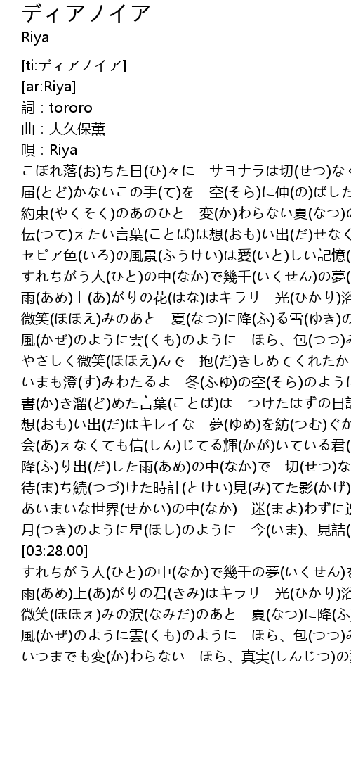 | [00:38.25] | 約束(やくそく)のあのひと 変(か)わらない夏(なつ)の日(ひ)々 |