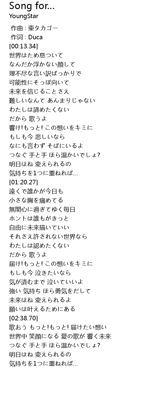 | [02:56.70] | 世界中 笑顔になる 愛の歌が 響く未来 |