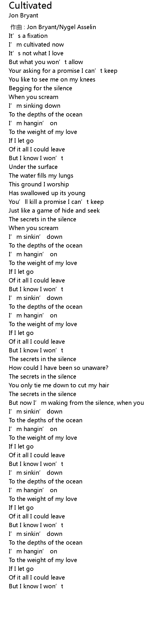 | [00:00.000] | zuo qu : Jon Bryant Nygel Asselin |