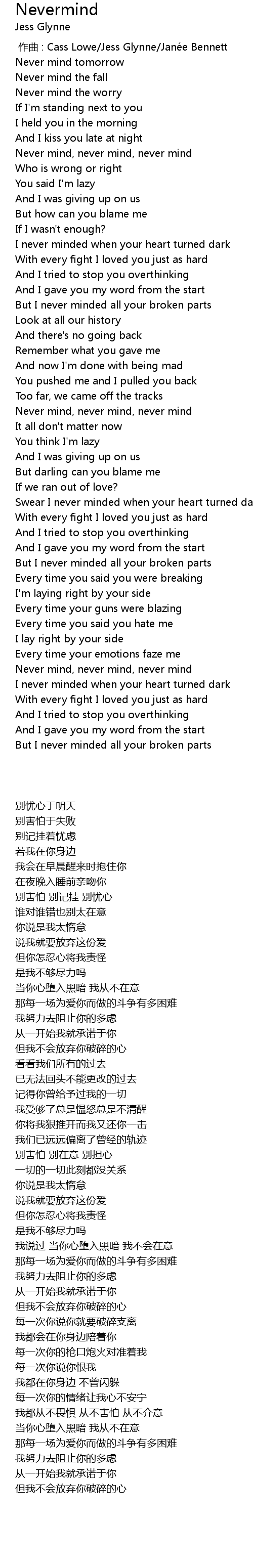 | [01:59.55] | Swear I never minded when your heart turned dark |