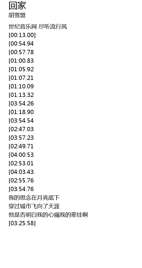 | [03:01.93][02:49.71][01:34.35][01:22.00] | wo hai pa yi ge ren hui jia |