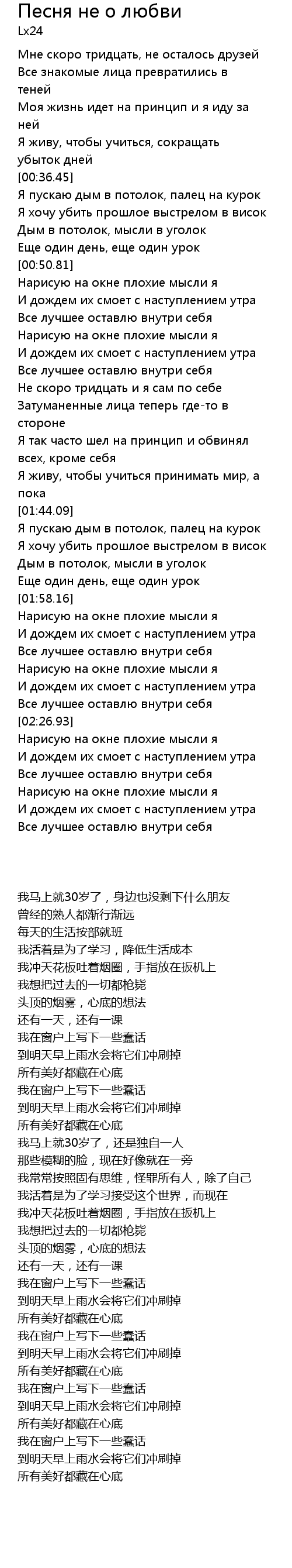 | [01:18.31] | Не скоро тридцать и я сам по себе |