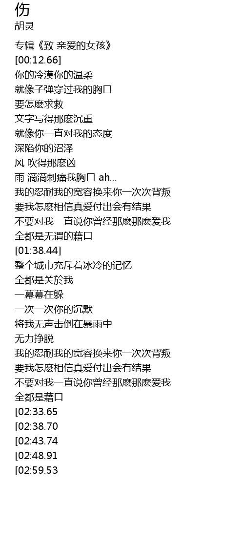 | [02:12.91] | 我的忍耐我的宽容换来你一次次背叛 |