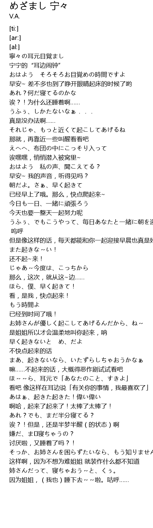 | [00:08.58] | 早安~ 差不多也到了睁开眼睛起床的时候了哟 |
