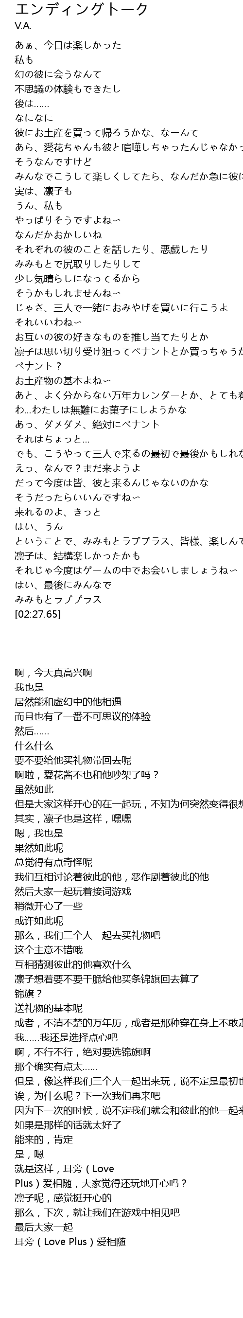 | [02:07.06] | 就是这样,耳旁(Love Plus)爱相随,大家觉得还玩地开心吗? |