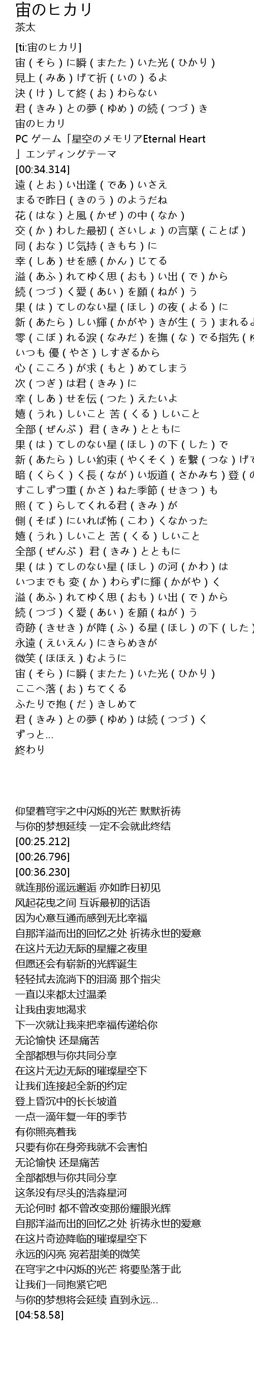 | [04:29.701] | 宙(そら)に瞬(またた)いた光(ひかり) ここへ落(お)ちてくる |