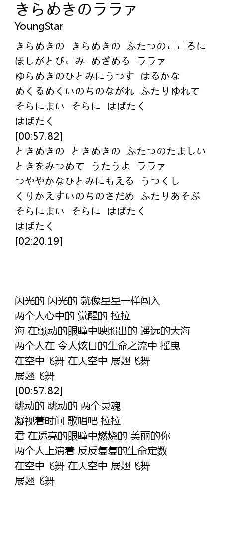 | [00:08.00] | きらめきの きらめきの ふたつのこころに |