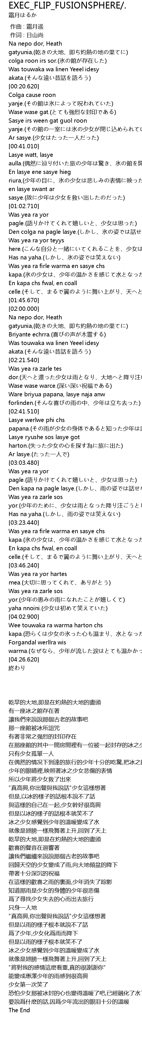 | [02:22.100] | Was yea ra zarle tes dor.(天へと還った少女は雨となり、大地へと降り注いだ) |
