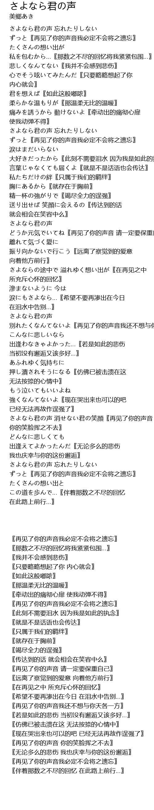 | [03:23.28] | さよなら君の声 忘れたりしない ずっと〖再见了你的声音我必定不会将之遗忘〗 |