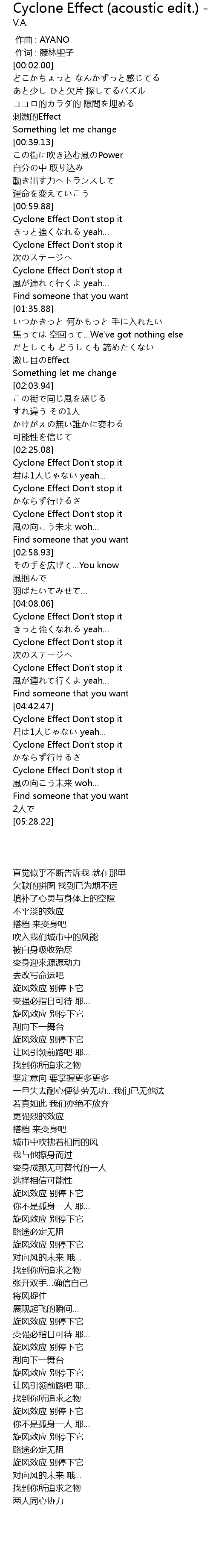 | [02:34.87] | Cyclone Effect Don' t stop it |