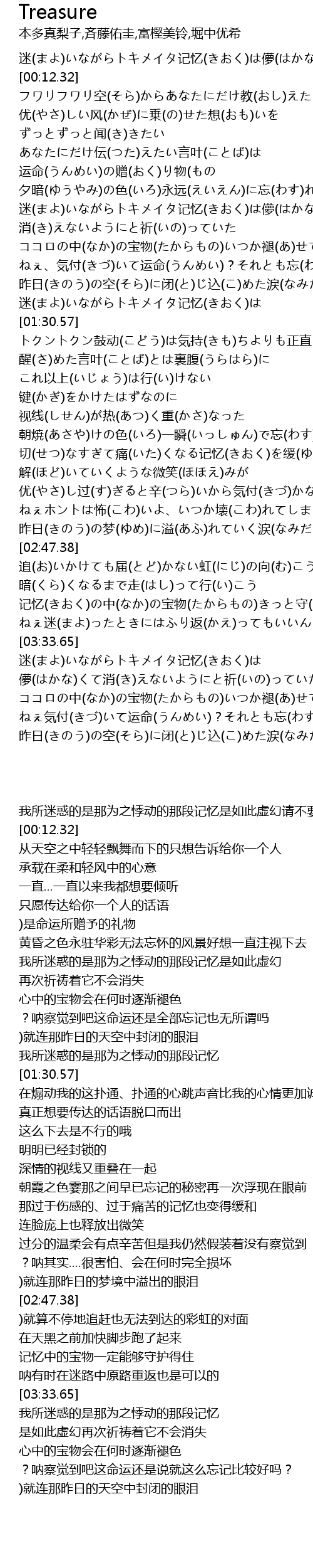 | [03:19.89] | 记忆(きおく)の中(なか)の宝物(たからもの)きっと守(まも)るから |