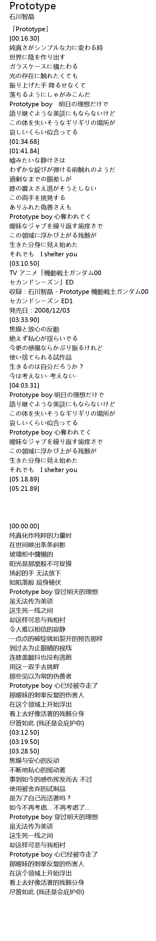 | [03:19.50] | 収録:石川智晶 - Prototype 機動戦士ガンダム00 セカンドシーズン ED1 |
