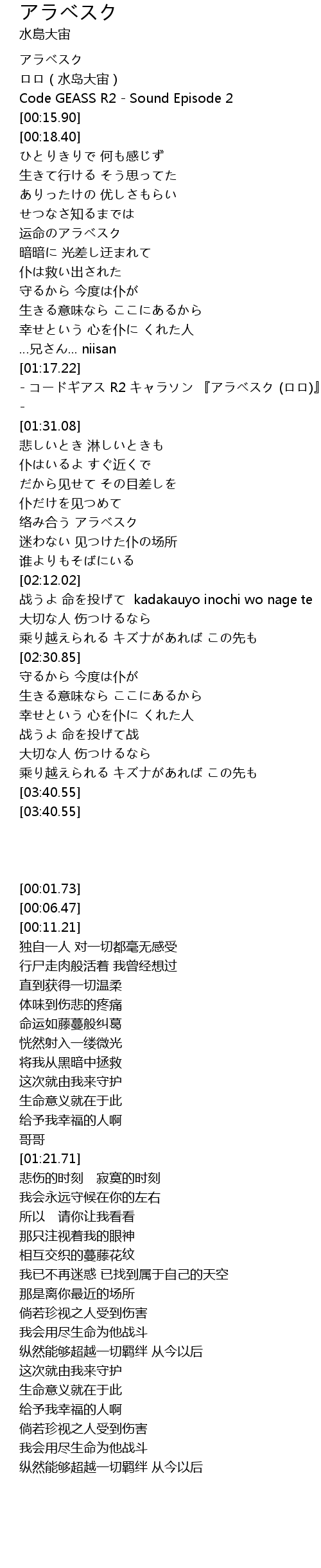| [01:21.71] | - コードギアス R2 キャラソン 『アラベスク (ロロ)』 - |