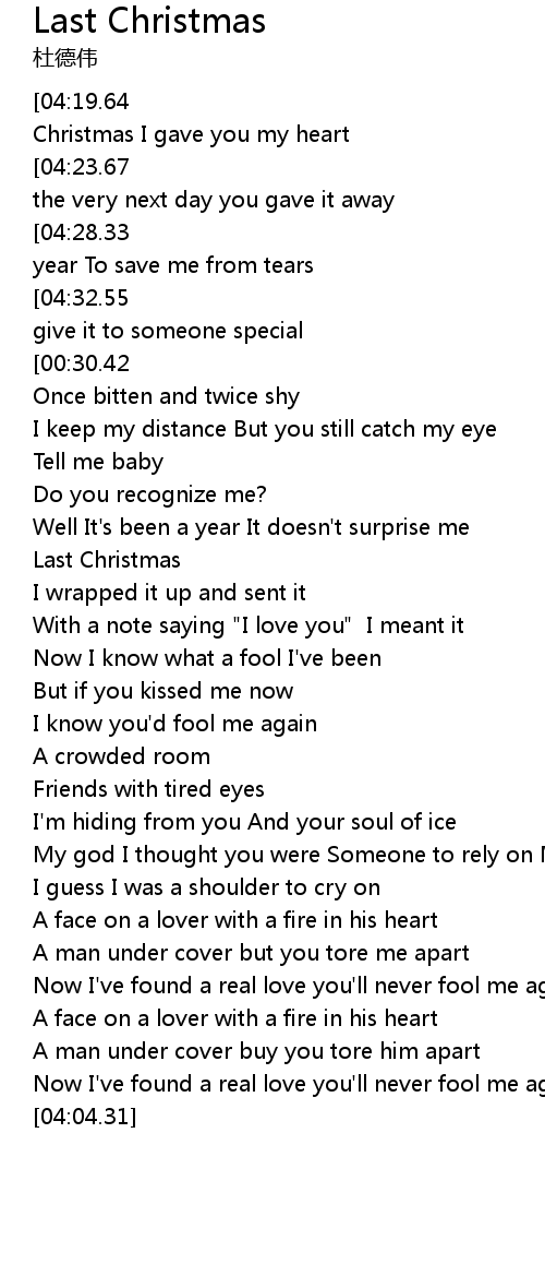 | [04:36.83][04:19.64][03:26.76][03:08.61][01:58.56][01:41.06][00:48.10][00:05.81] | Last Christmas I gave you my heart |