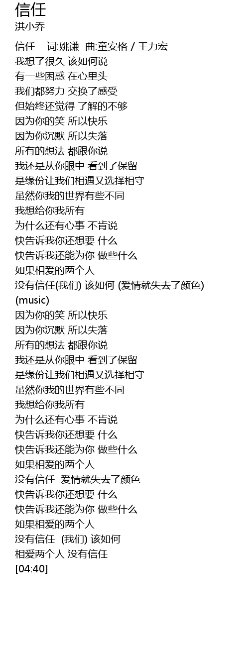 | [00:00] | 信任 词:姚谦 曲:童安格 / 王力宏 |