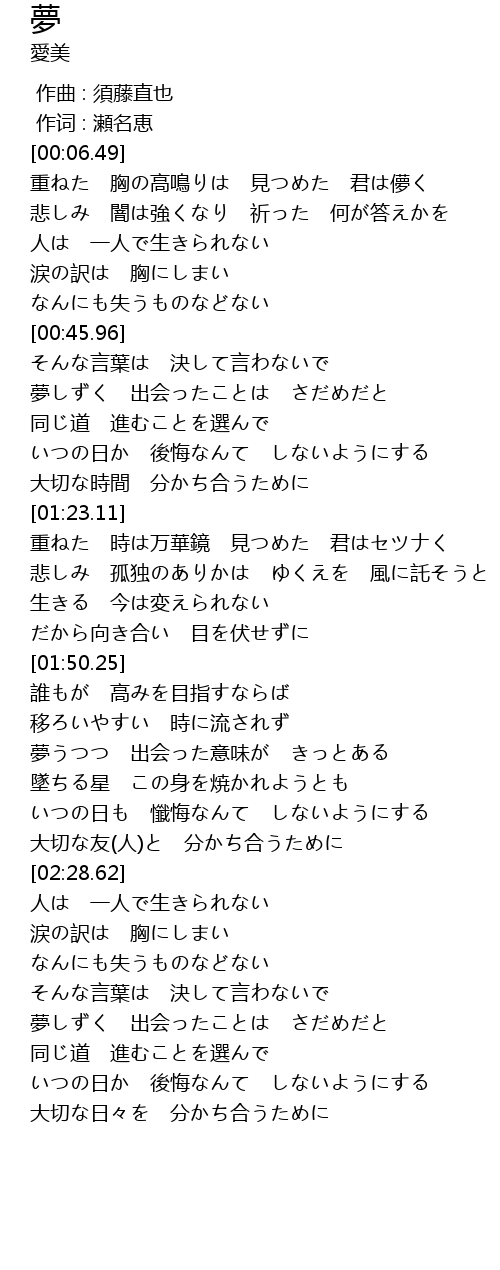 | [02:02.11] | 夢うつつ 出会った意味が きっとある |