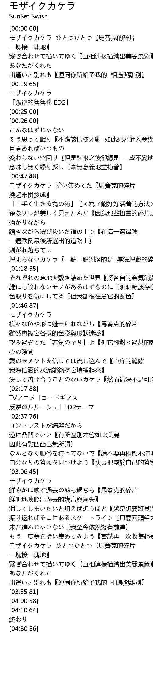 | [00:04.65] | モザイクカケラ ひとつひとつ〖馬賽克的碎片 一塊接一塊地〗 |