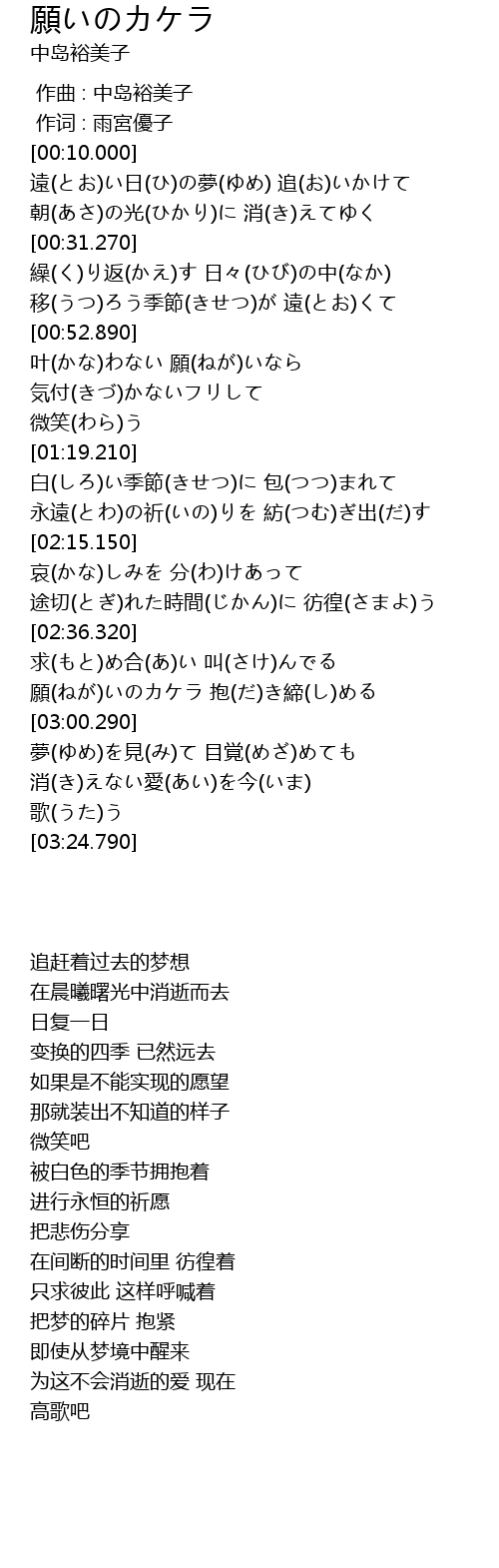 | [02:50.830] | 願(ねが)いのカケラ 抱(だ)き締(し)める |