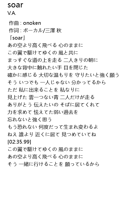 | [03:08.21] | あの空より高く飛べる 心のままに |