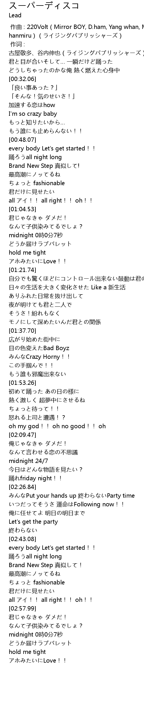 | [00:00.000] | 作曲 : 220Volt(Mirror BOY, D.ham, Yang whan, Moon hanmiru)(ライジングパブリッシャーズ) |