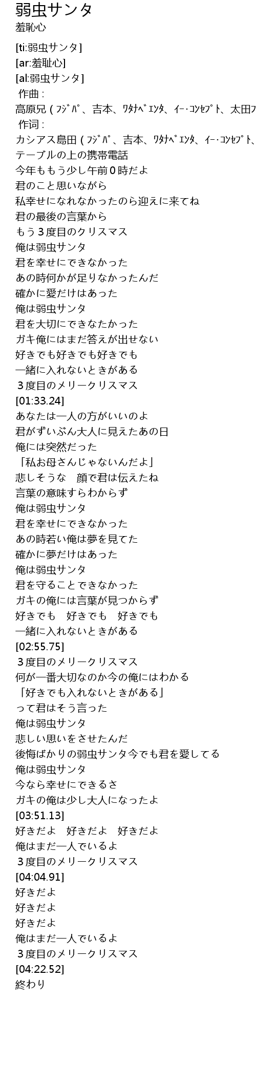 | [03:37.64] | 俺は弱虫サンタ |