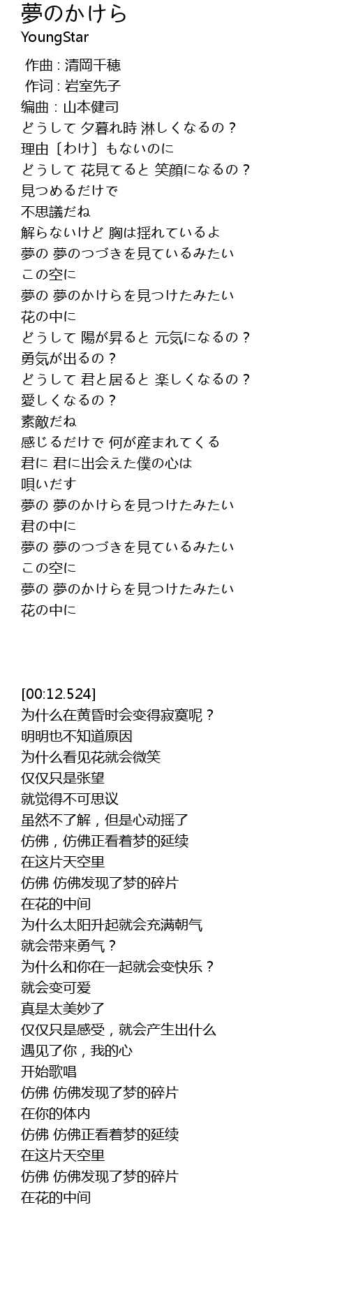 | [02:38.531] | 夢の 夢のかけらを見つけたみたい |