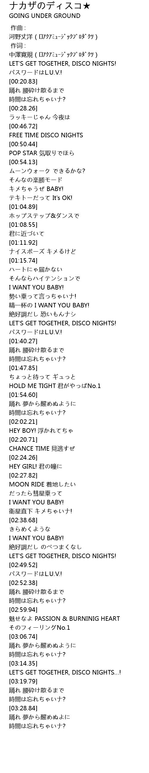 | [03:15.43] | LET'S GET TOGETHER, DISCO NIGHTS…! |