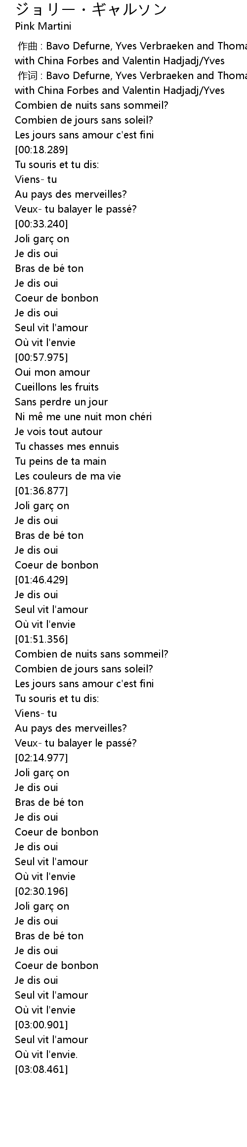 | [01:19.070] | Ni m me une nuit mon ché ri |